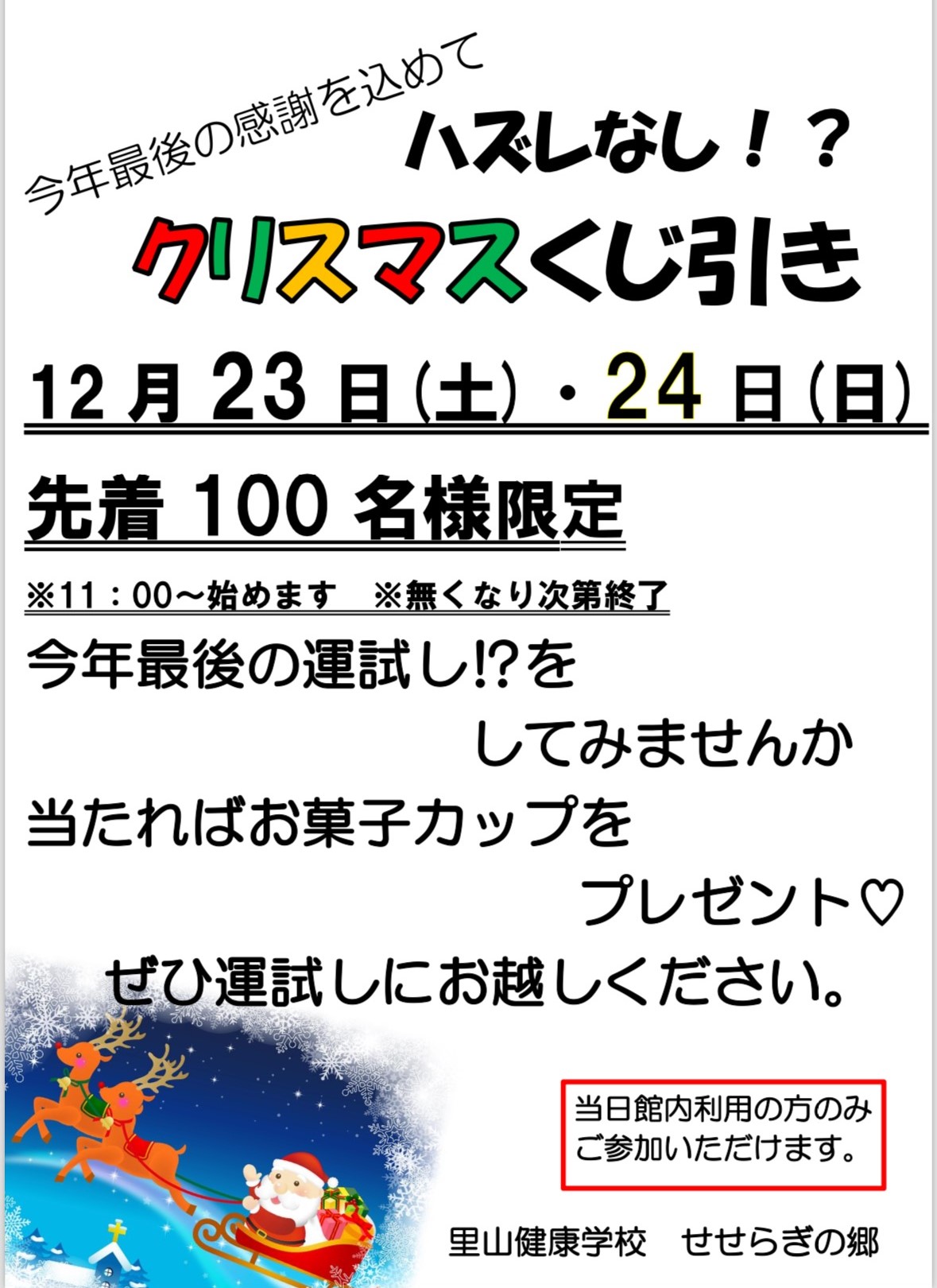 12月23日(土)、24日(日)11:00より、『ハズレなし?!クリスマスくじ引き』を実施いたします。