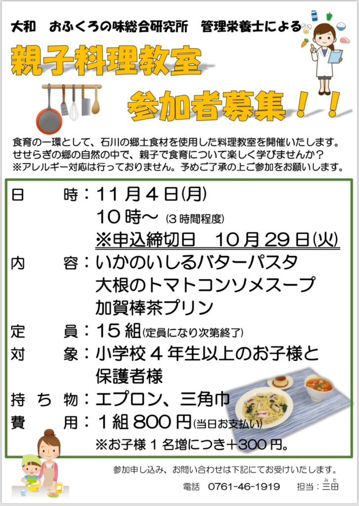 大和 おふくろの味総合研究所 管理栄養士による料理教室を開催いたします!石川の郷土食材を使用した料理教室となっております。せせらぎの郷の自然の中で、楽しく食育について学びませんか?日程は11月4日(月)10:00~、小学4年生以上のお子様と保護者... -