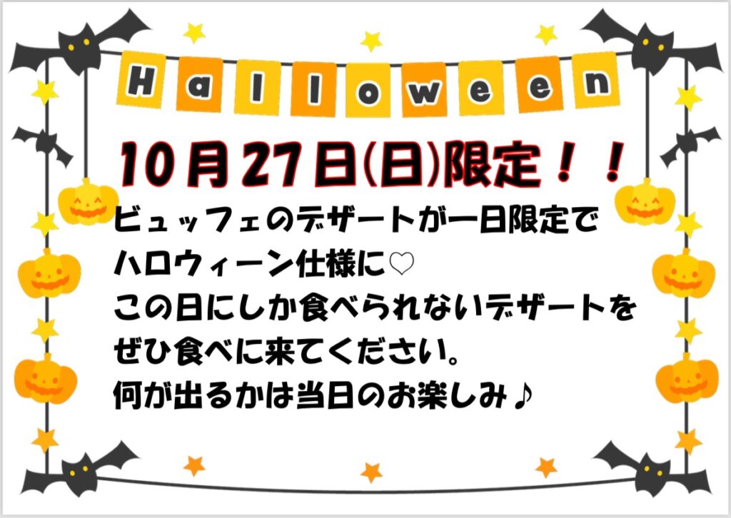 10月27日(日)限定で、ひと足早いハロウィーンを実施いたします!!いつもとは少し違ったビュッフェをお楽しみください。何が出てくるかは当日のお楽しみ♪皆様のご来店心よりお待ちしております。 -