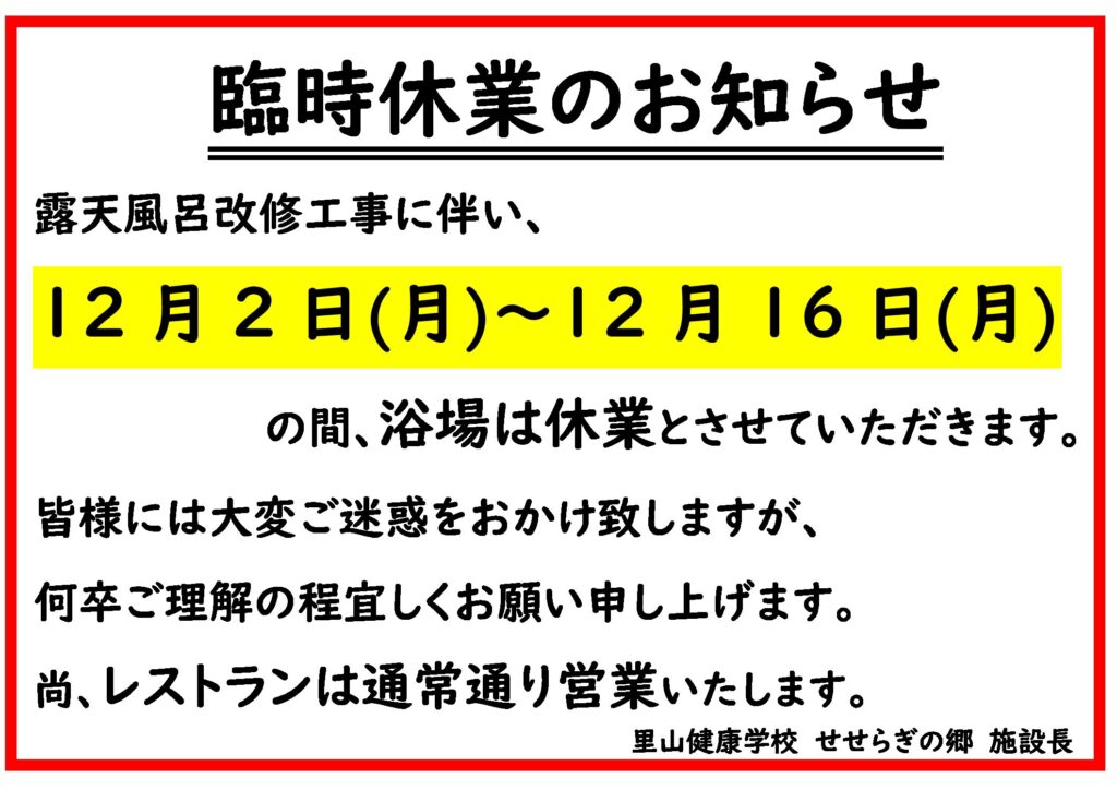 12月2日(月)~16日(月)の間、露天風呂改修工事に伴い浴場は臨時休業とさせていただきます。皆様には大変ご不便をおかけいたしますが、何卒ご理解の程宜しくお願いいたします。尚、レストランは通常営業いたしますので、是非ともご利用ください。 -