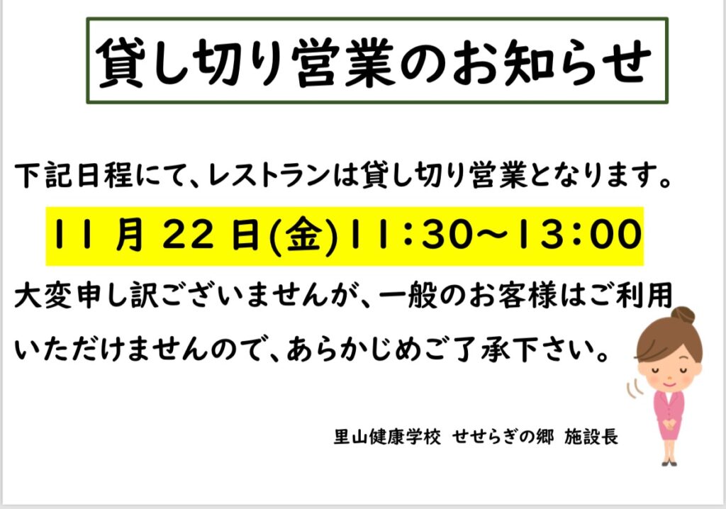 11月22日(金)11:30~13:00までの間、レストランは貸し切り営業となります。一般のお客様はご利用になれませんので予めご了承下さい。尚、13:00より通常通りご利用になれます。 -