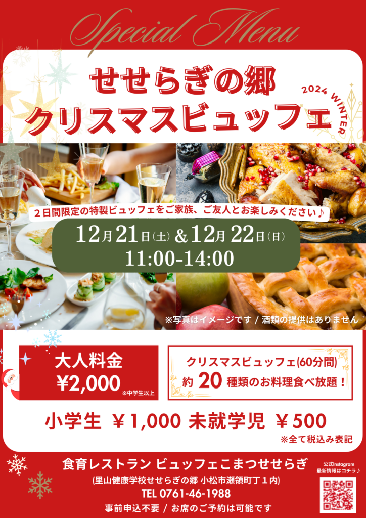 みなさんこんにちは!小松の里山でランチビュッフェが楽しめる「食育レストランビュッフェこまつせせらぎ」です。今年も12月冬到来!クリスマスのシーズンですね。 クリスマスランチビュッフェを初開催! 今回、当館ではクリスマス限定企画をご用意しま... -