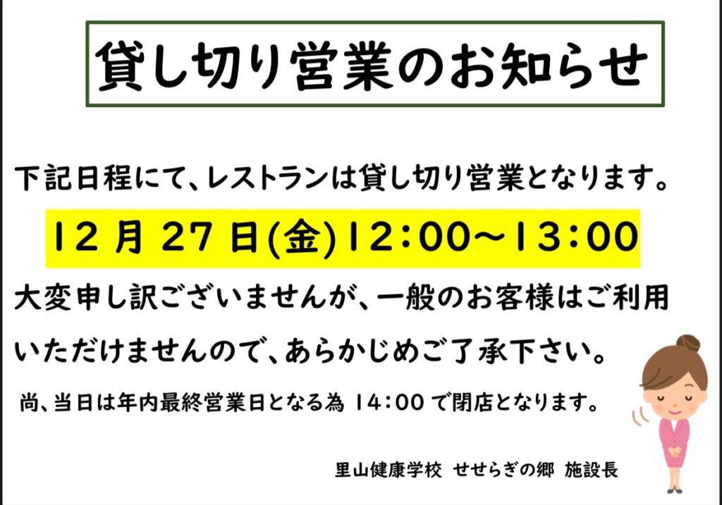 12月27日(金)12:00~13:00までの間、レストランは貸し切り営業となります。一般のお客様はご利用になれませんので予めご了承下さい。尚、27日はレストラン最終営業日となりますので、14:00で閉店となります。 -