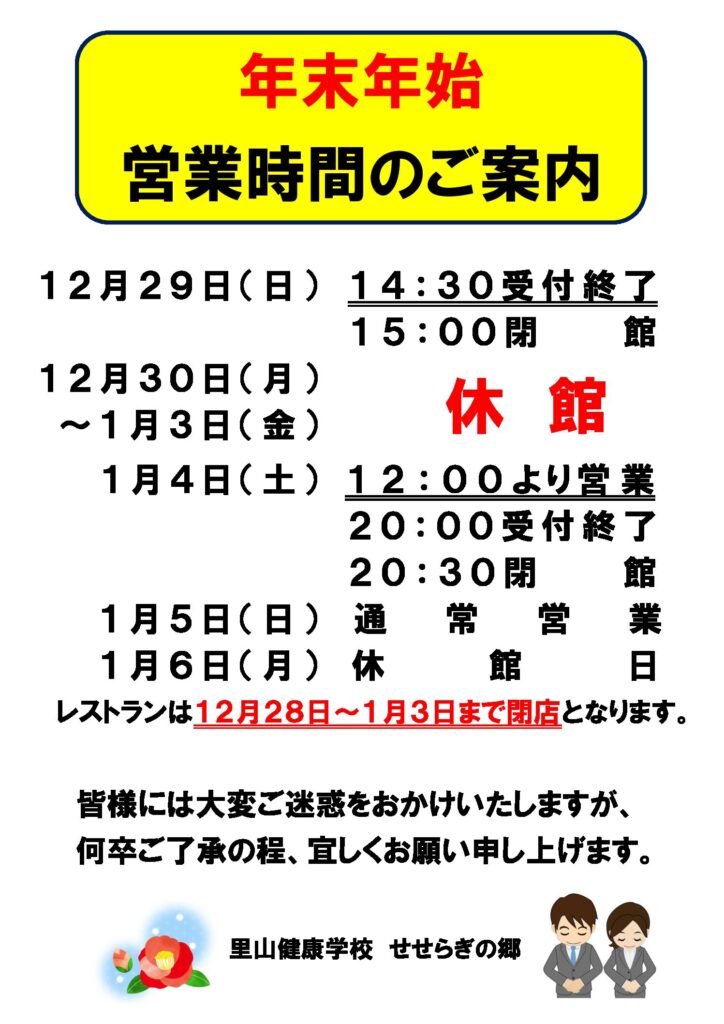 早いもので今年も残すところわずかとなって参りました。本年も皆様には、沢山ご利用心から感謝申し上げます。皆様には大変ご不便をおかけいたしますが、浴場は12月30日(月)~1月3日(金)までお休みとなります。レストランは28日(土)よりお休みとなります。... -