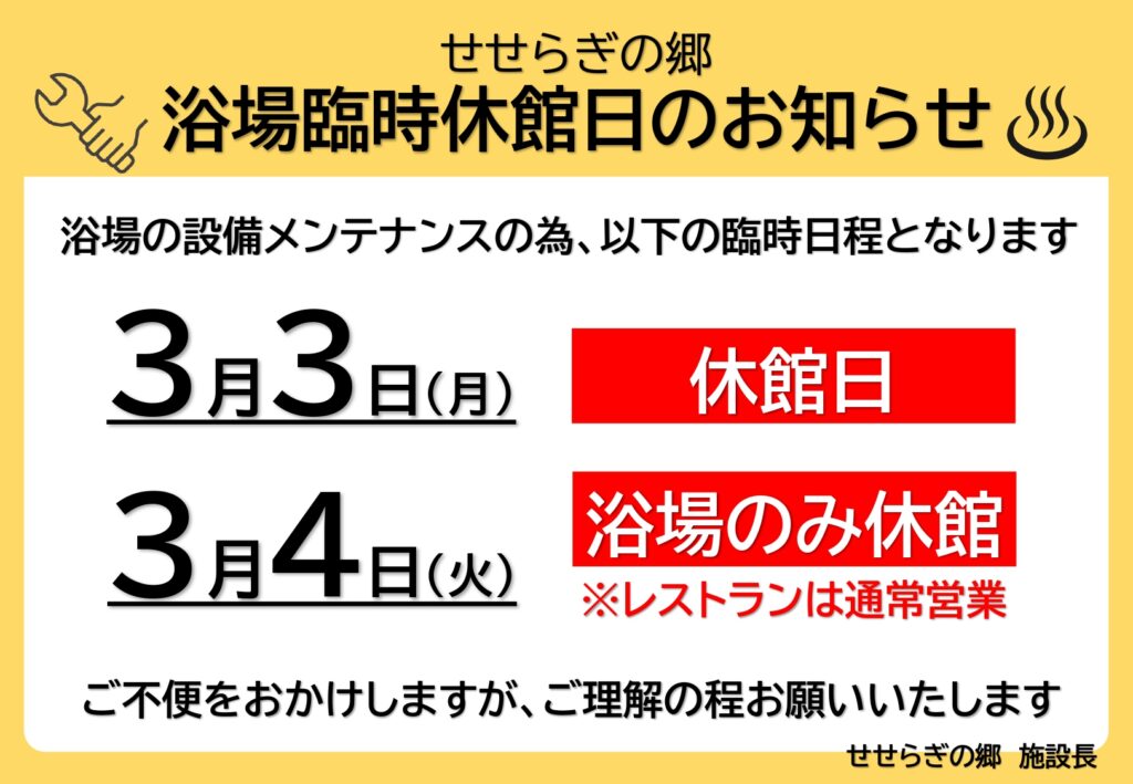 浴場臨時休館日のお知らせ 浴場メンテナンスの為、臨時日程で営業いたします。 令和7年3月3日(月) 休館日3月4日(火) 浴場のみ休館 (※レストランは通常営業) ご不便をおかけしますが、よろしくお願い致します。せせらぎの郷 施設長 -